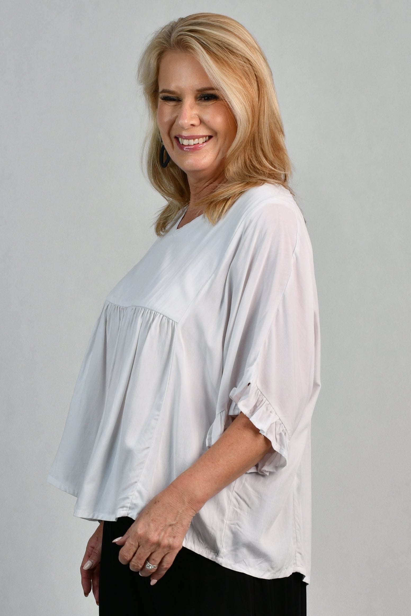 Our Kelly top is a fan favourite for good reason! With gorgeous 1/2 sleeve with small frill detailing and a gorgeous v-neck with beautiful bottom detailing! So easy to co ordinate with our beautiful range of pants.
