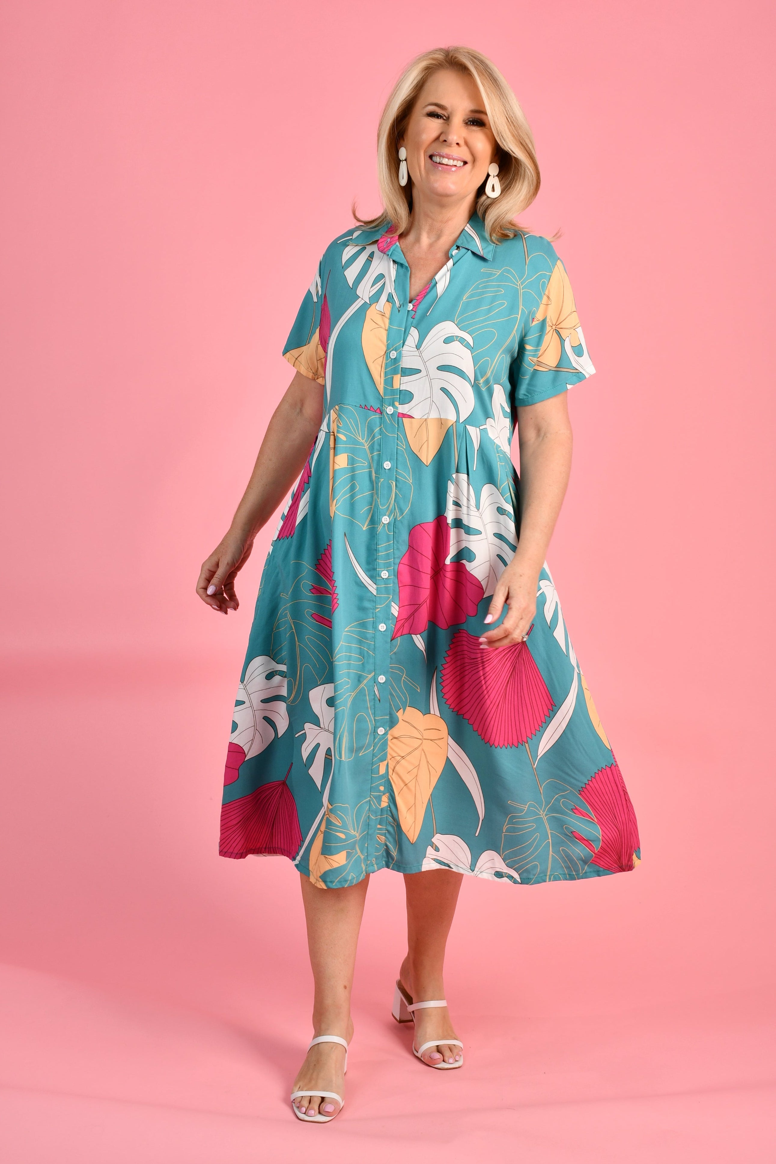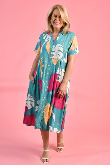 VBLD589 - FREYA MIDI DRESS - MAGIC MONSTERA TEAL