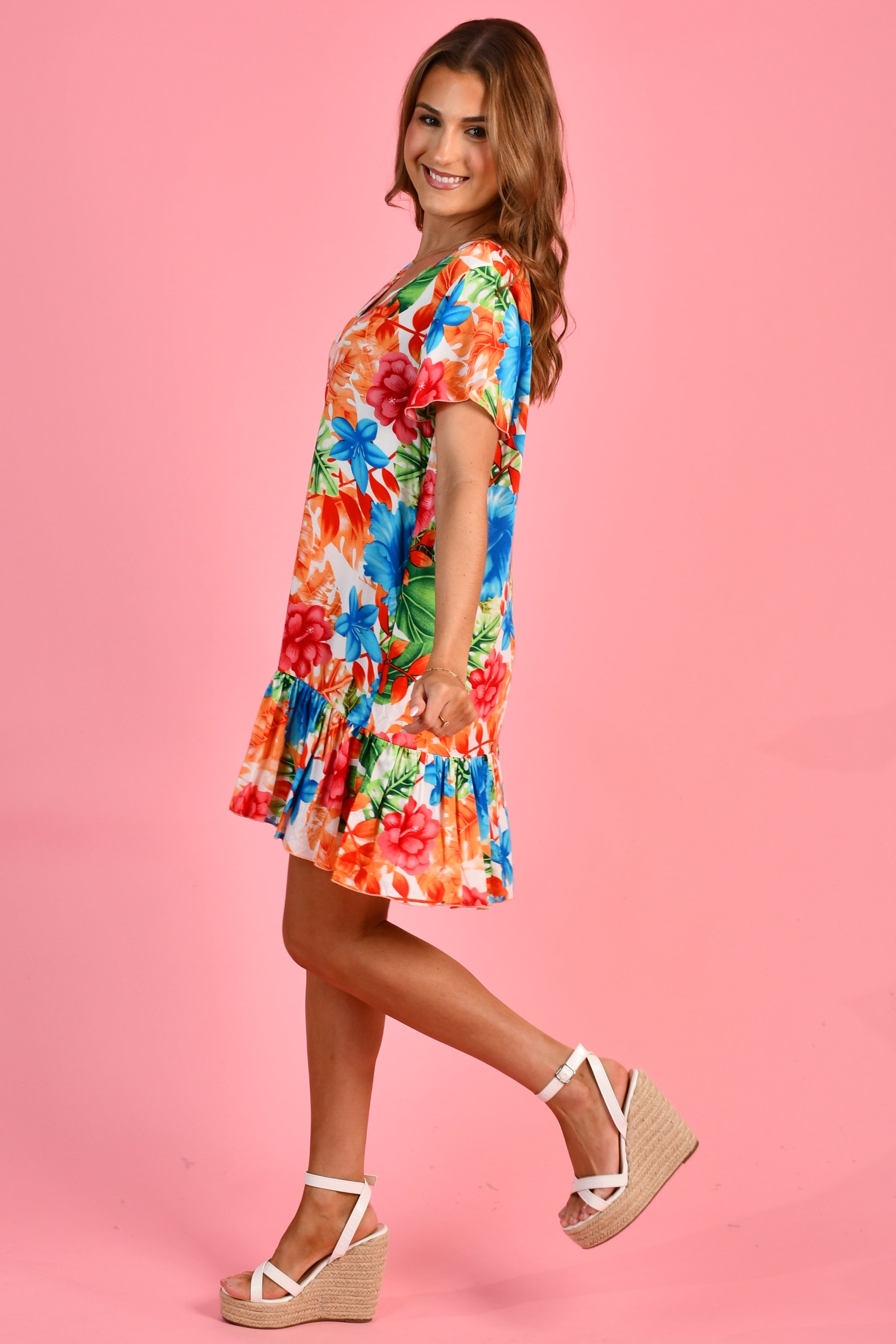 VGLD219 - CAP SLEEVE BUTTON DRESS - HAWAIIAN RAINBOW