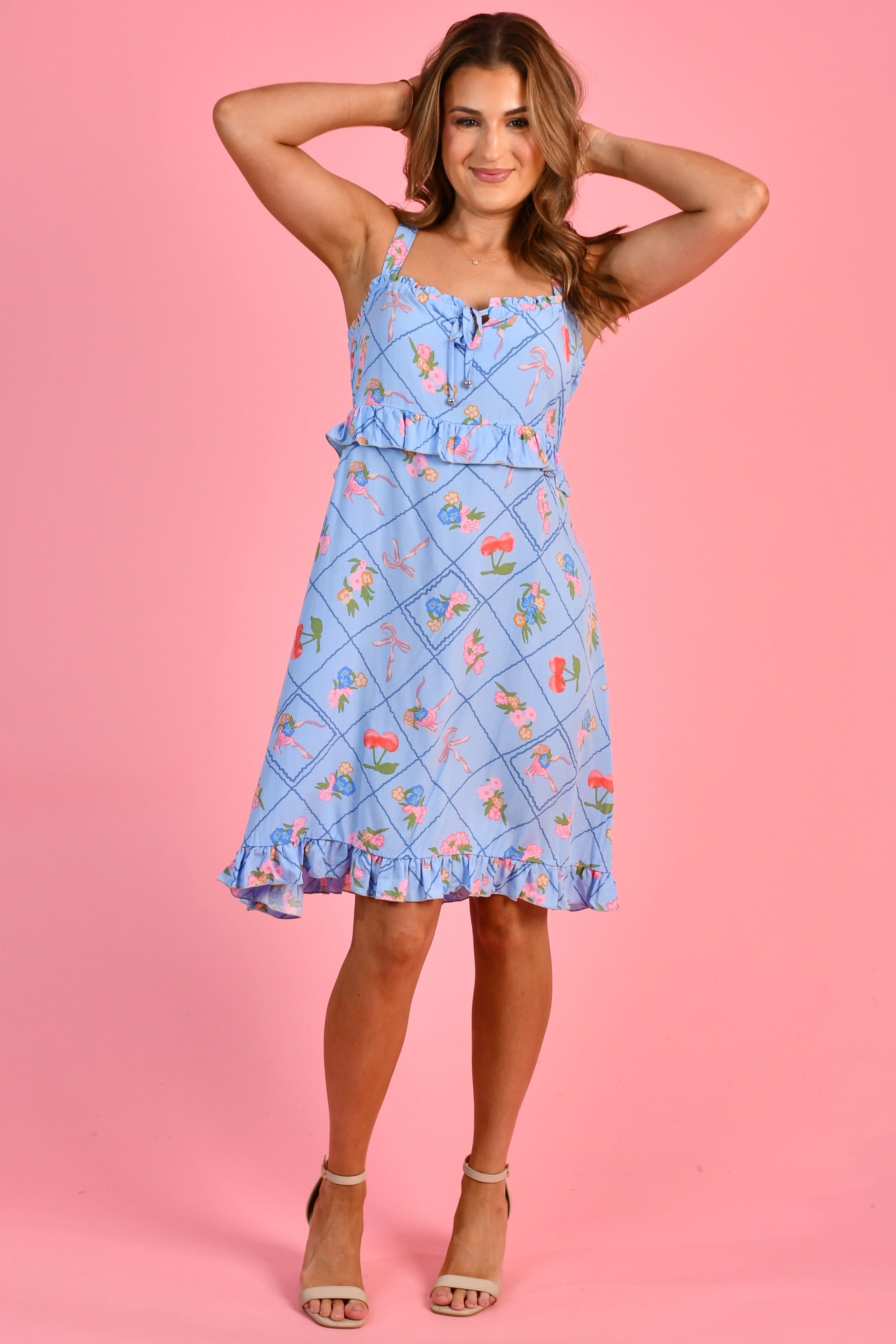 Our Sunset Ruffle Dress in our beautiful Bows & Blooms print has landed!πŸŒΈπŸŽ€