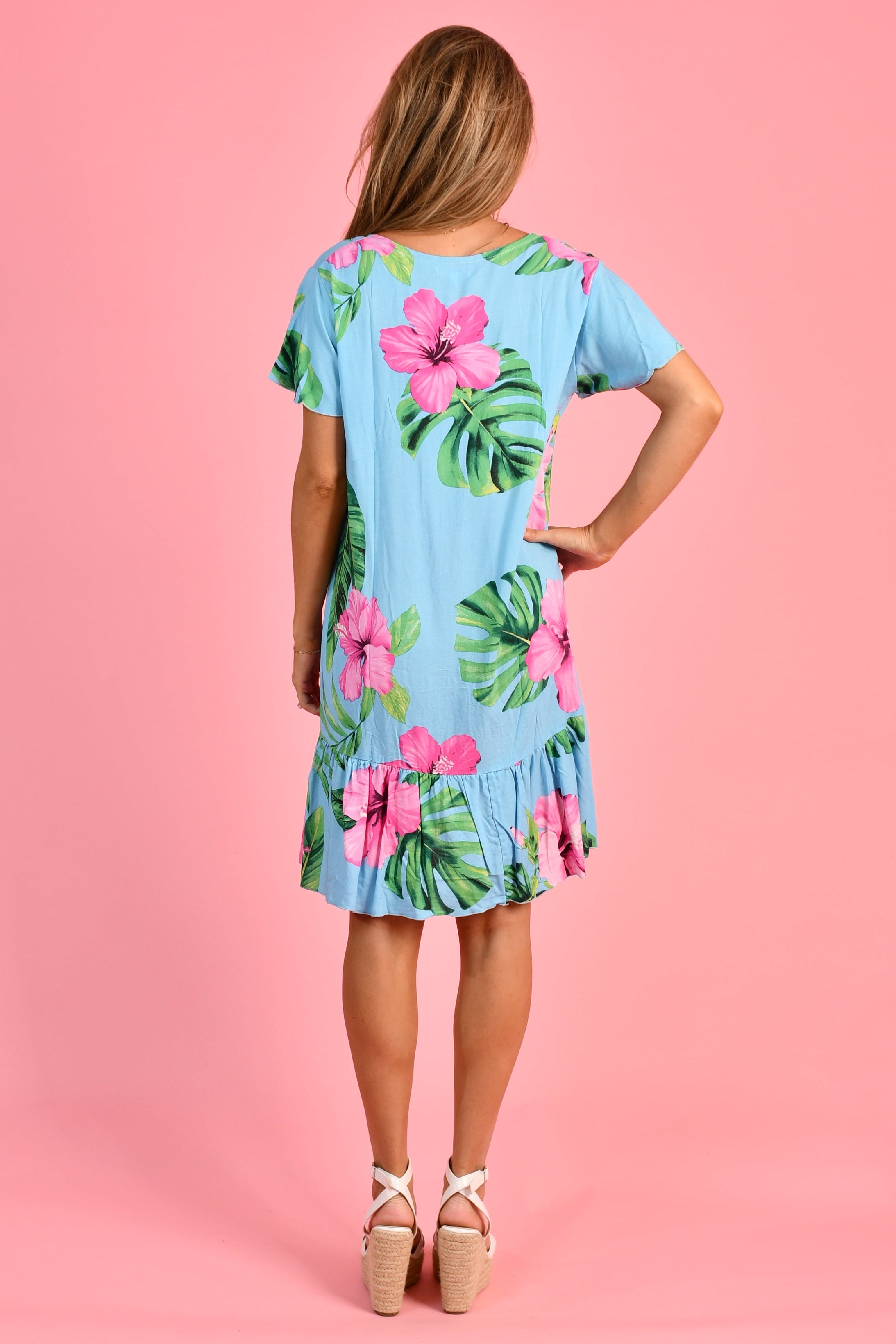 The perfect dress to put on when the weather is warm. It's an above the knee, relaxed fitting style featuring a cute ruffle around the hemline. It would look fantastic worn over tights or leggings when the weather begins to cool down.
