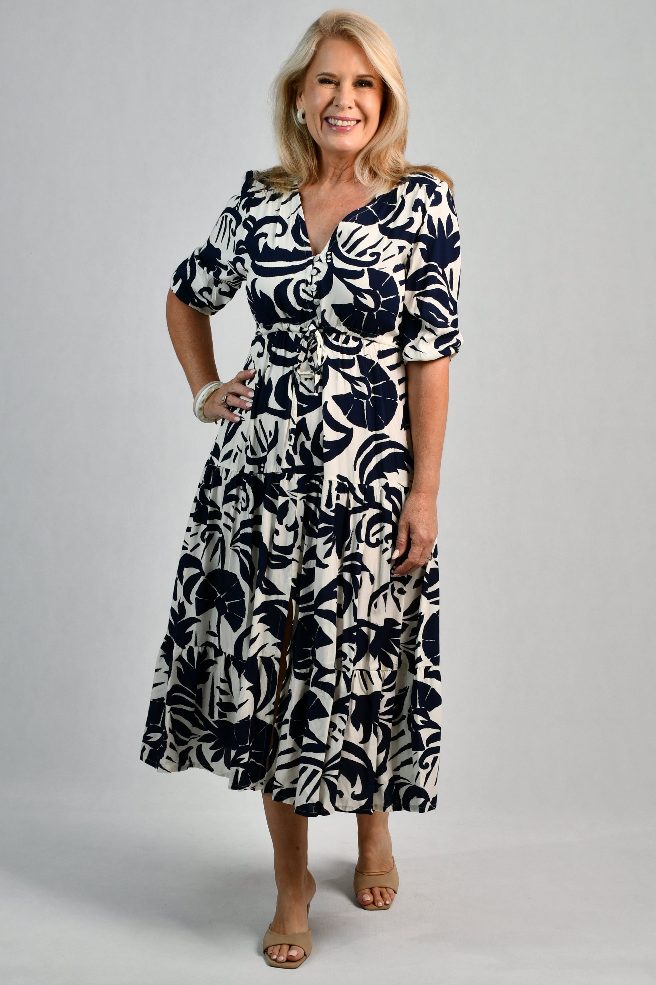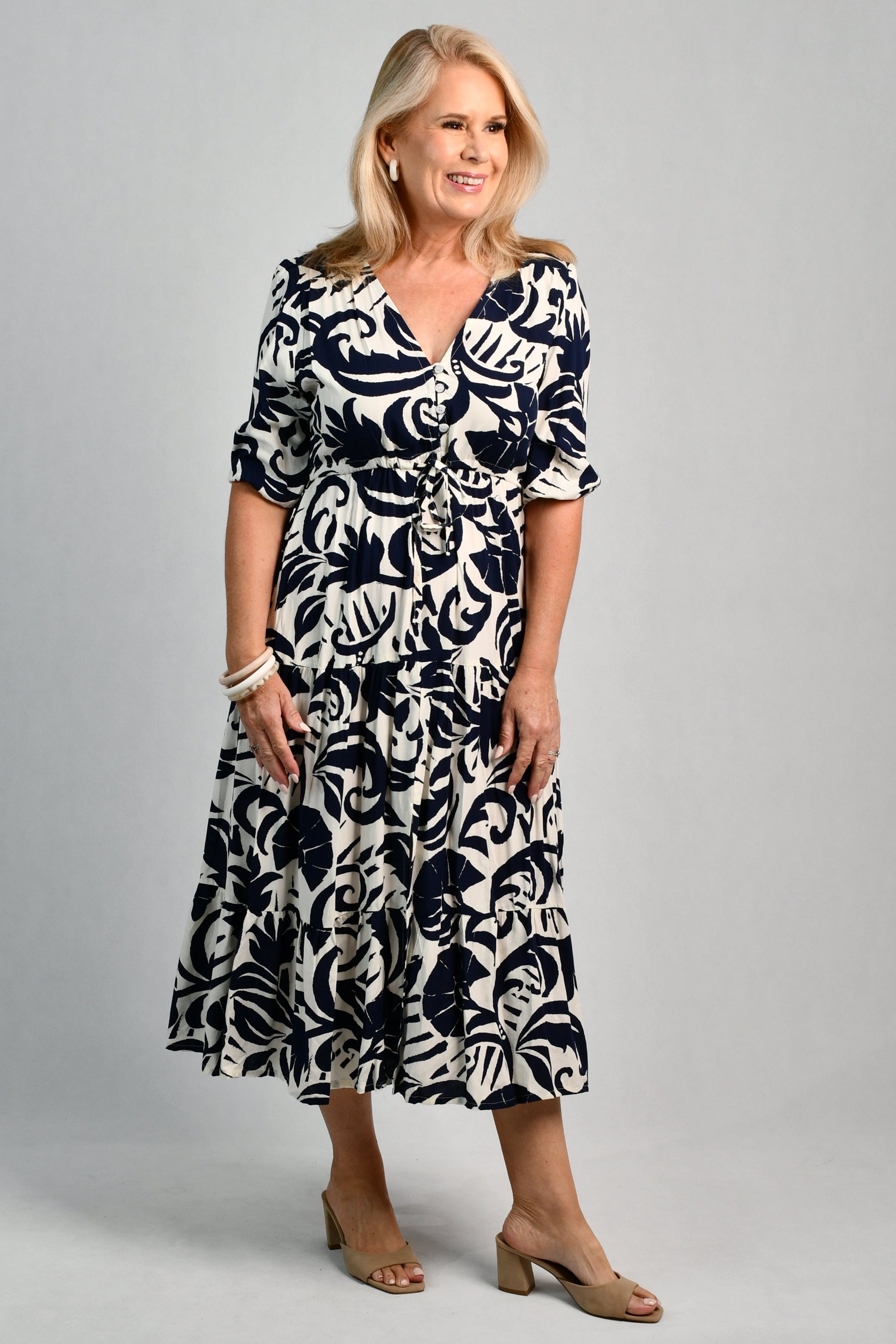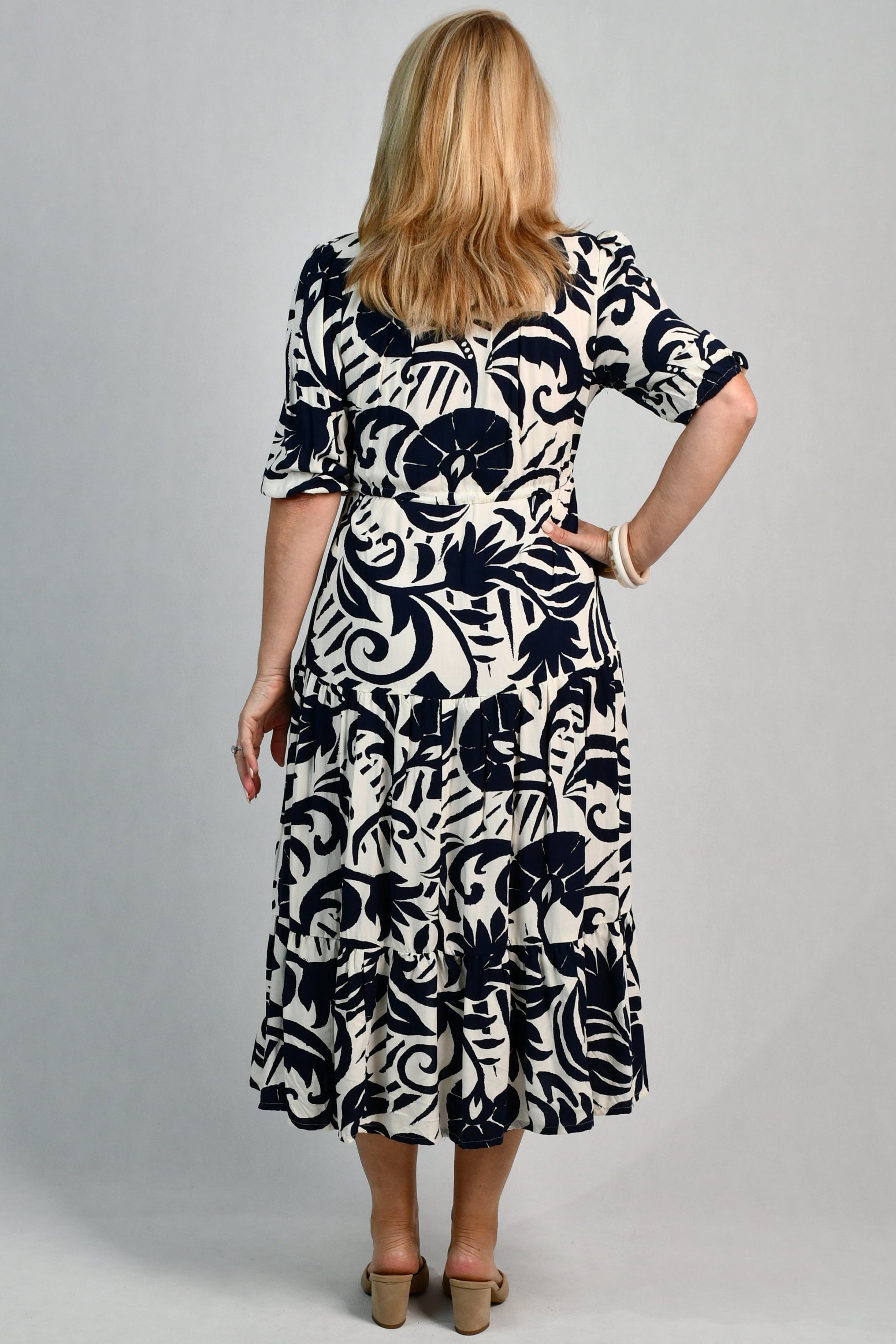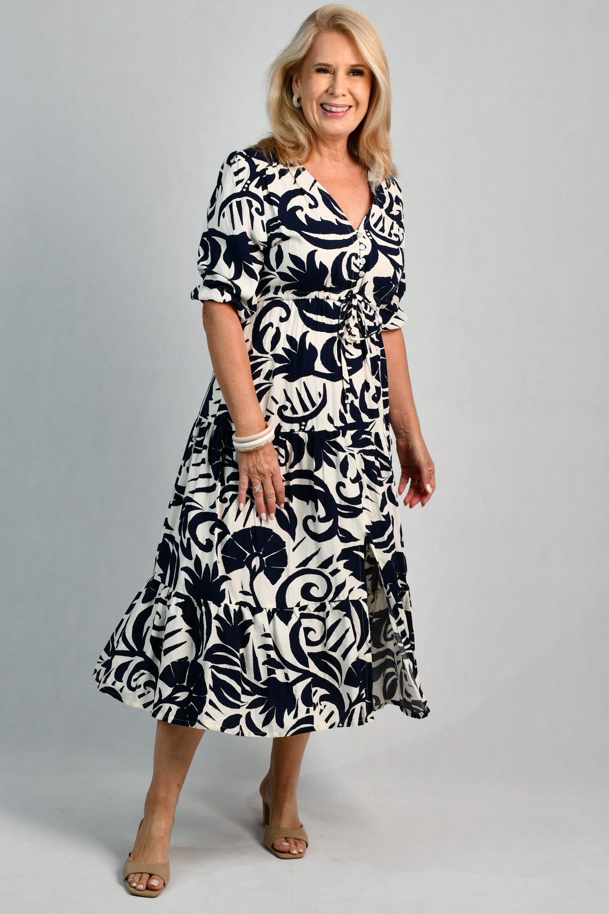 Our Pamela Midi Dress is a breath of fresh air. With a beautiful v-neckline, buttons and synched waist, it is flowy and flattering on all body shapes!