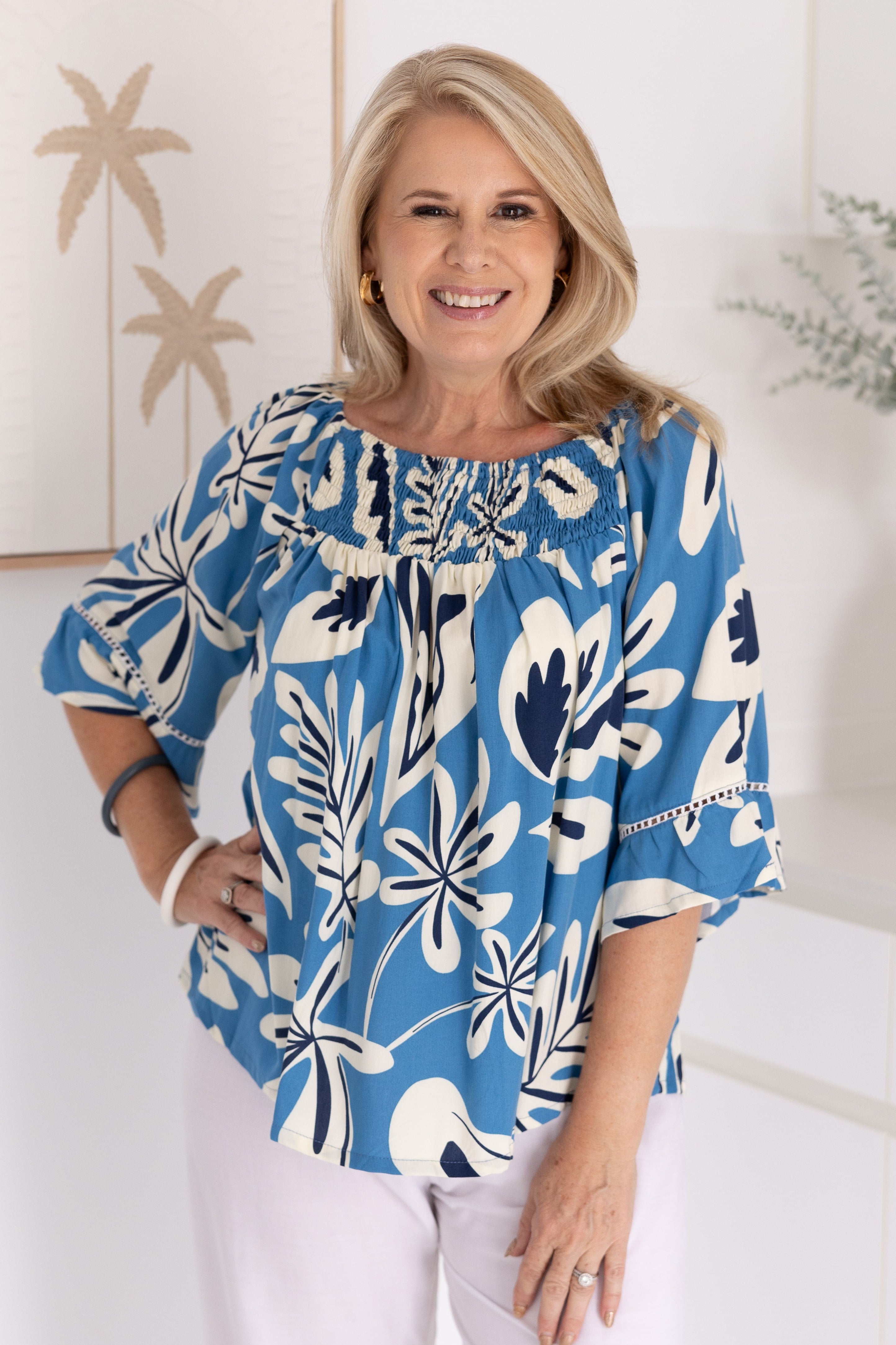 VBLT113 - ROUCHED BELL SLEEVE TOP - TROPIC BLUE