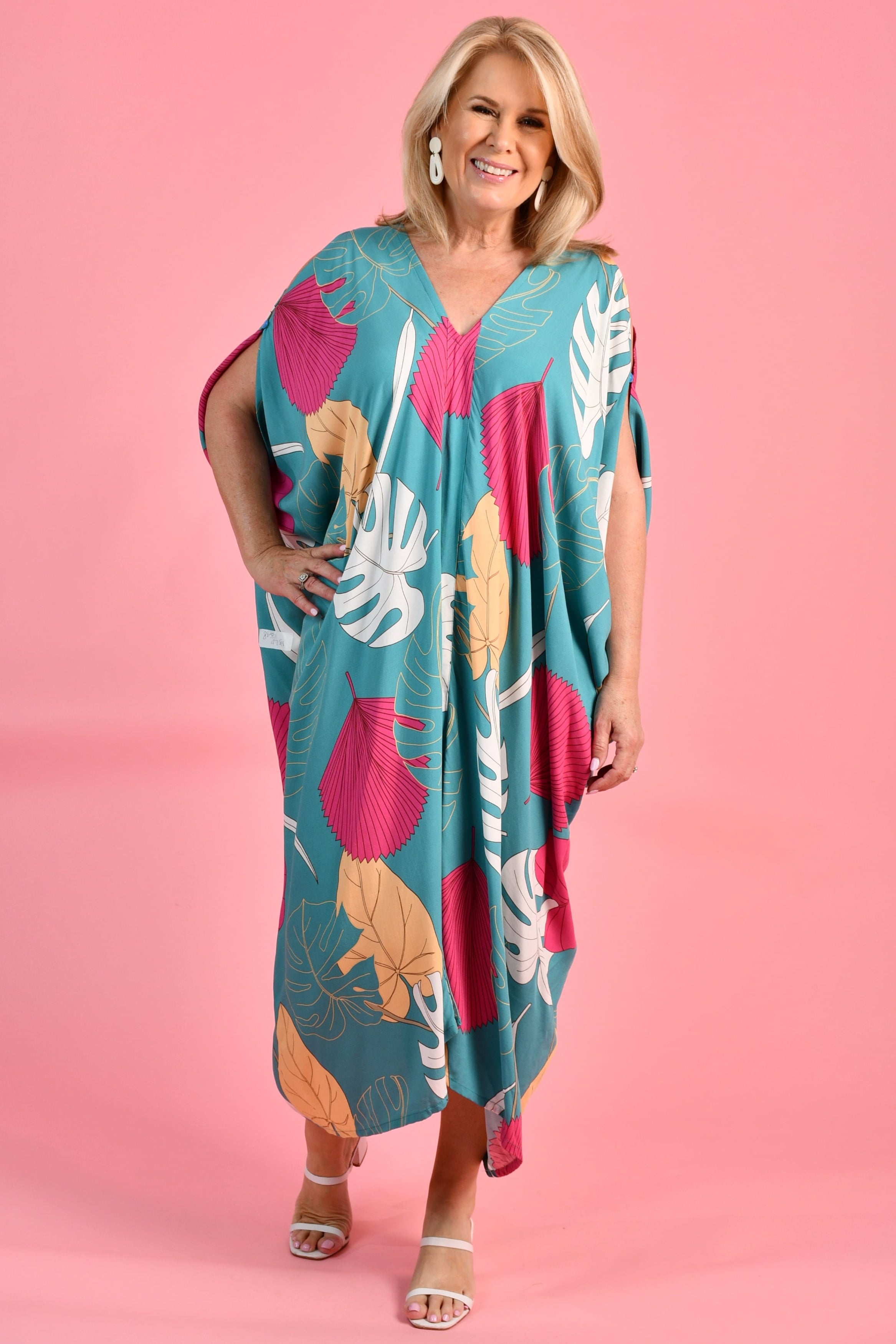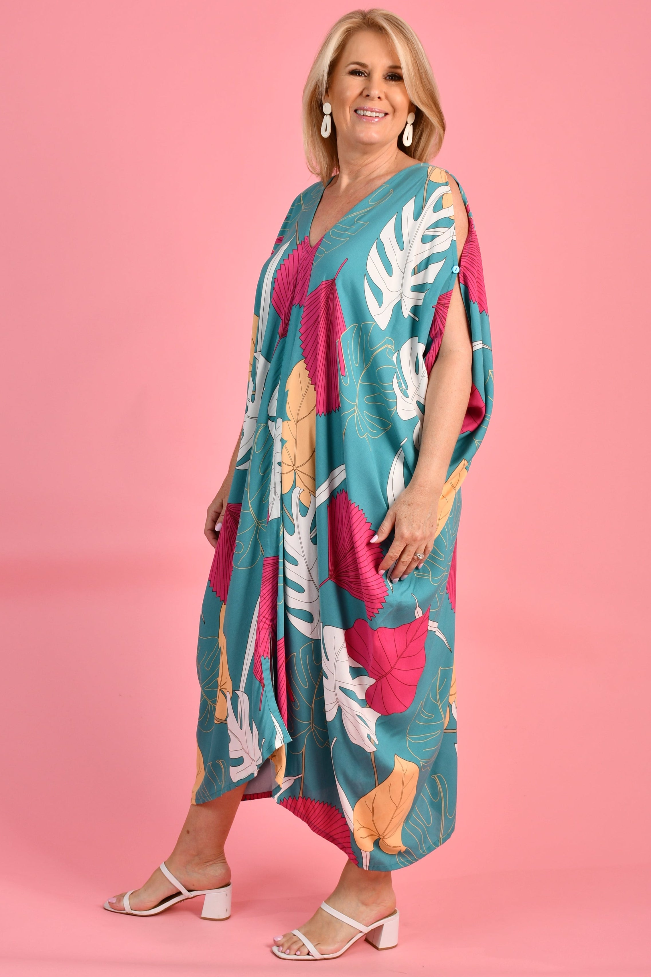 A gorgeous kaftan style that ticks all the boxes! Cool, comfortable, easy to wear, generous in size-all wrapped up in a show stopping print that will have you looking like a Summer Goddess! This is a great Maternity option for the Mum-to-be, you might even choose to wear it to your Baby Shower.