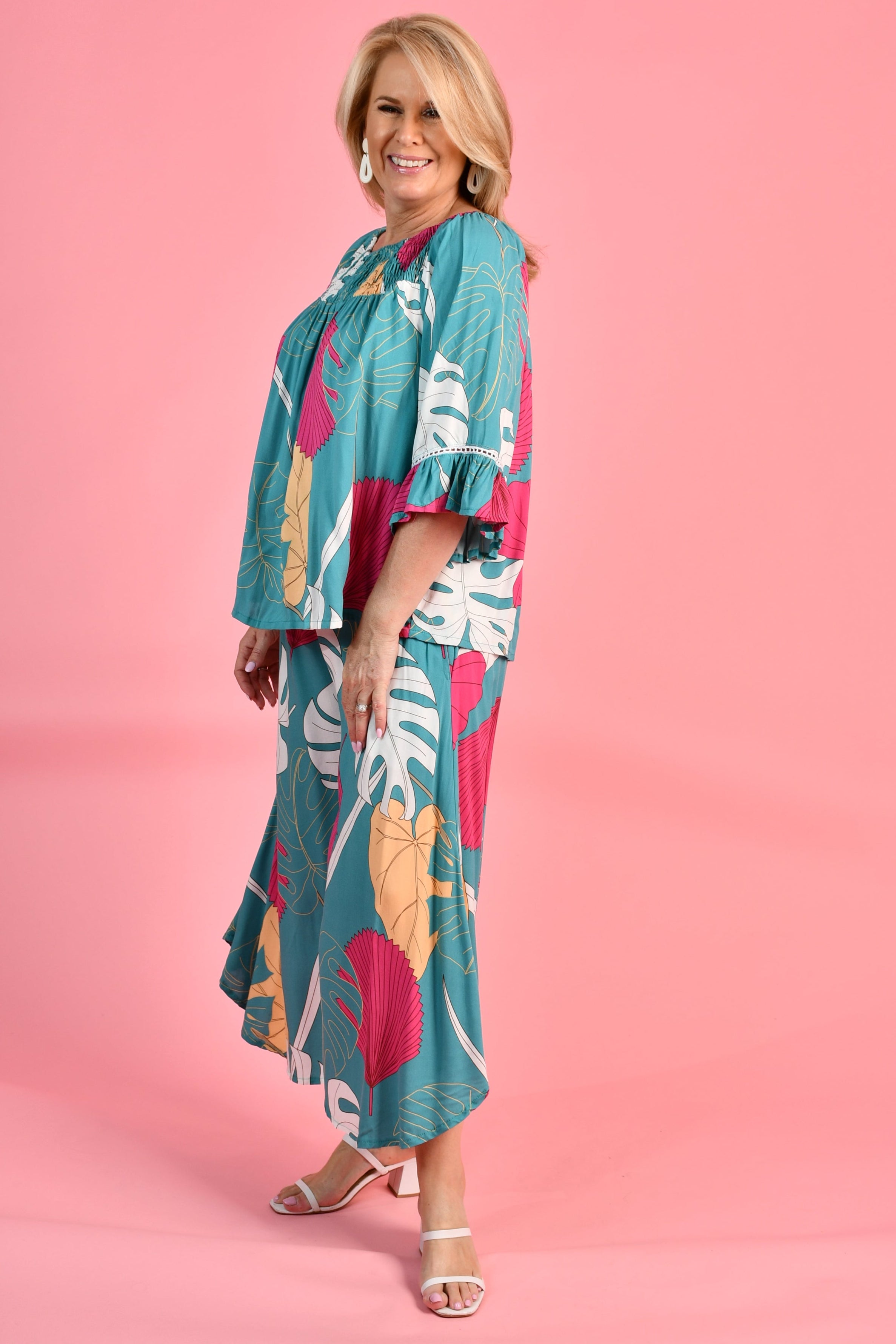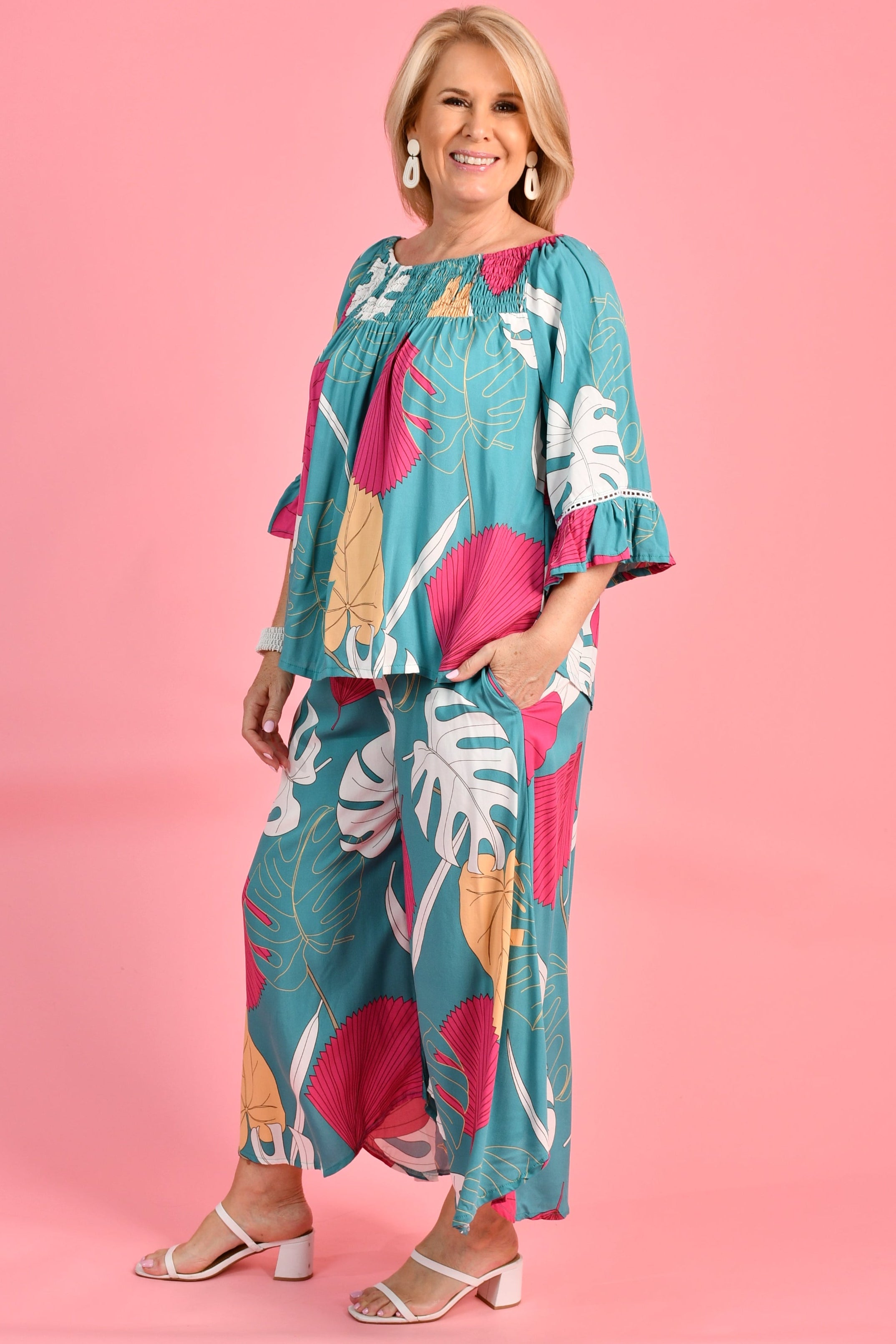 VBLP106 - SYDNEY WIDE LEG PANT - MAGIC MONSTERA TEAL