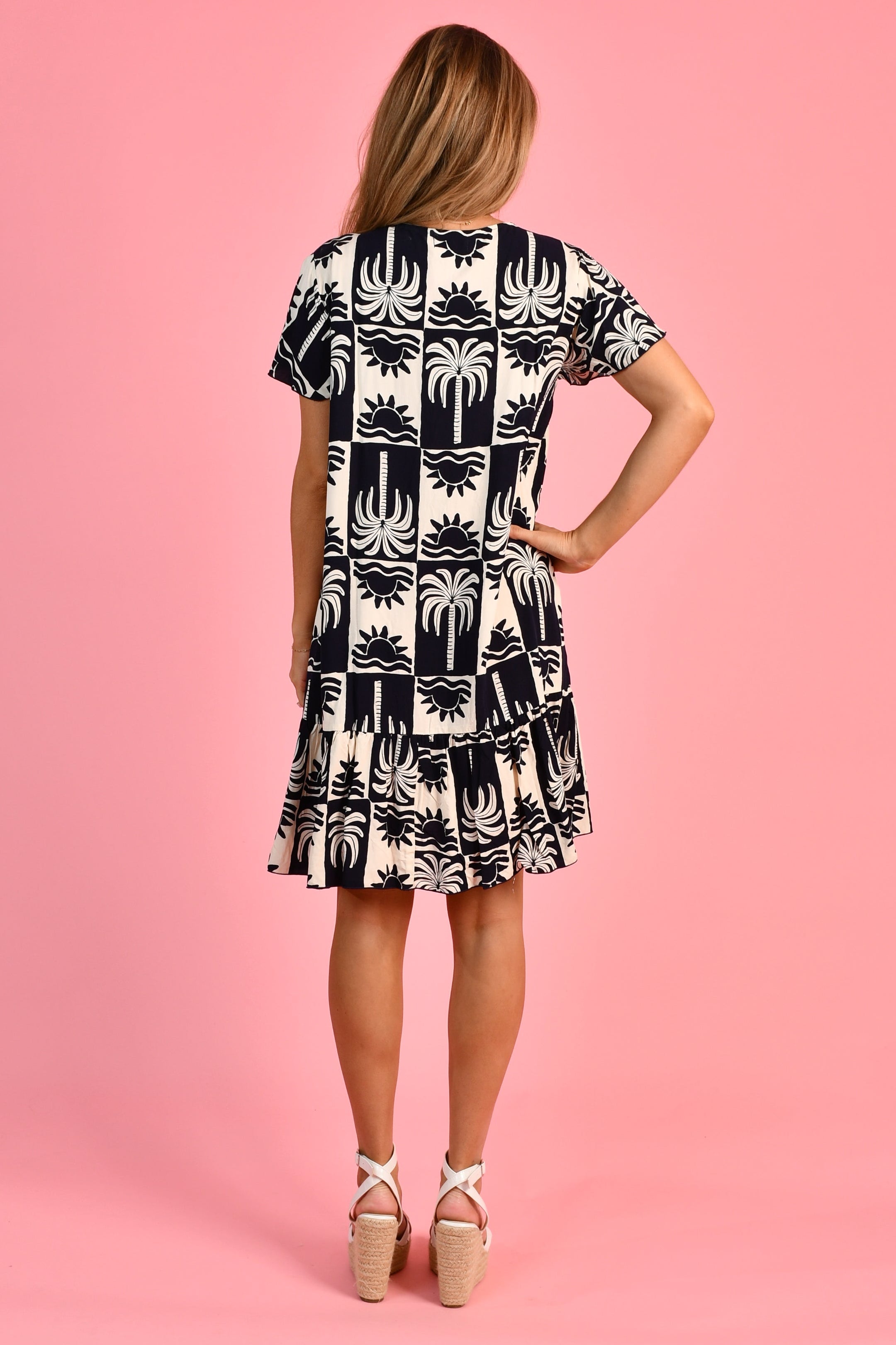 VGLD219 - CAP SLEEVE BUTTON DRESS - PALM HORIZON BLACK