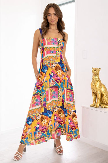This long maxi dress features updated, thicker straps for extra comfort and support. The bright, colourful Moroccan safari print makes it a standout piece for any wardrobe. Lightweight and easy to wear, it’s perfect for customers looking for effortless style in a long, flowing dress.