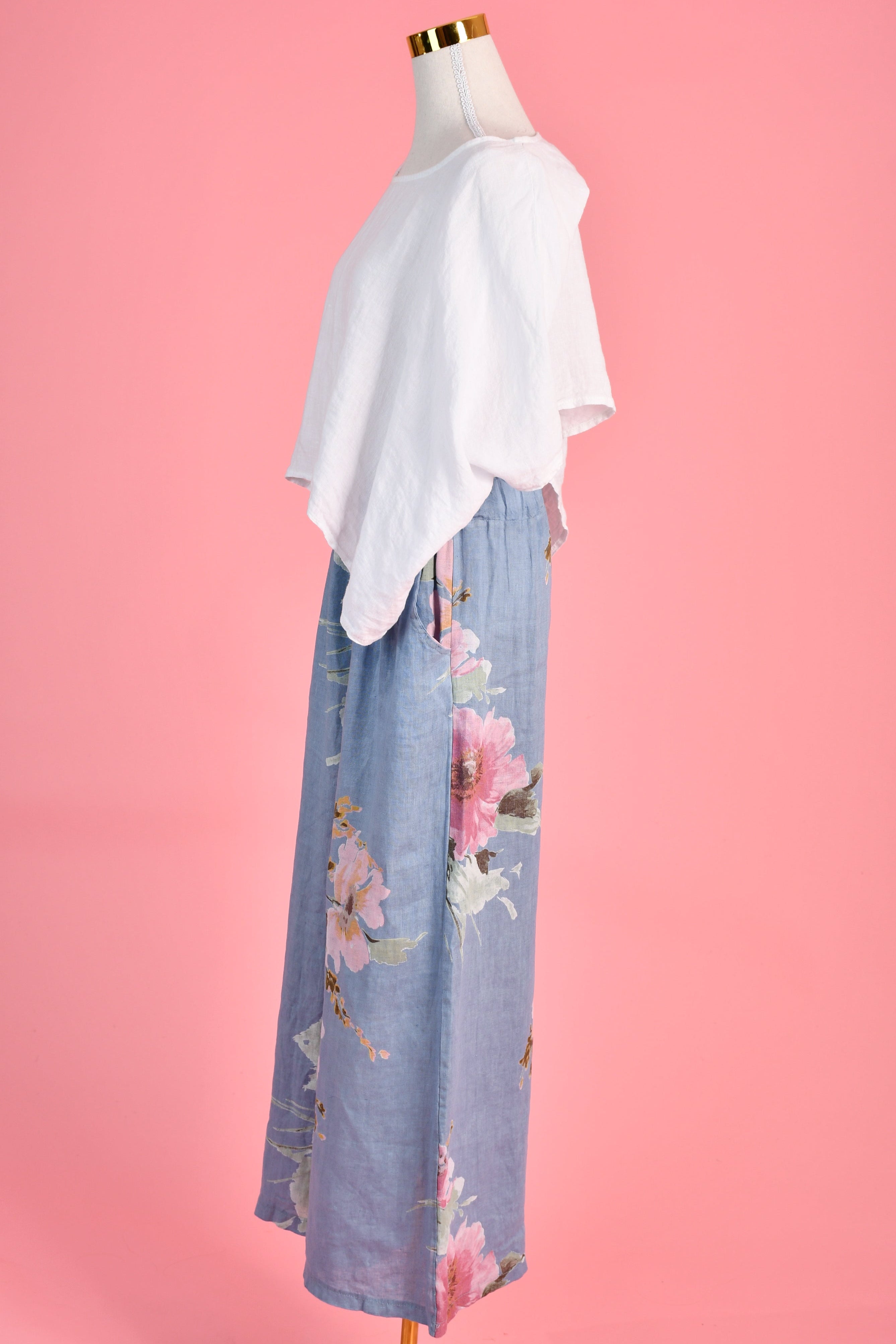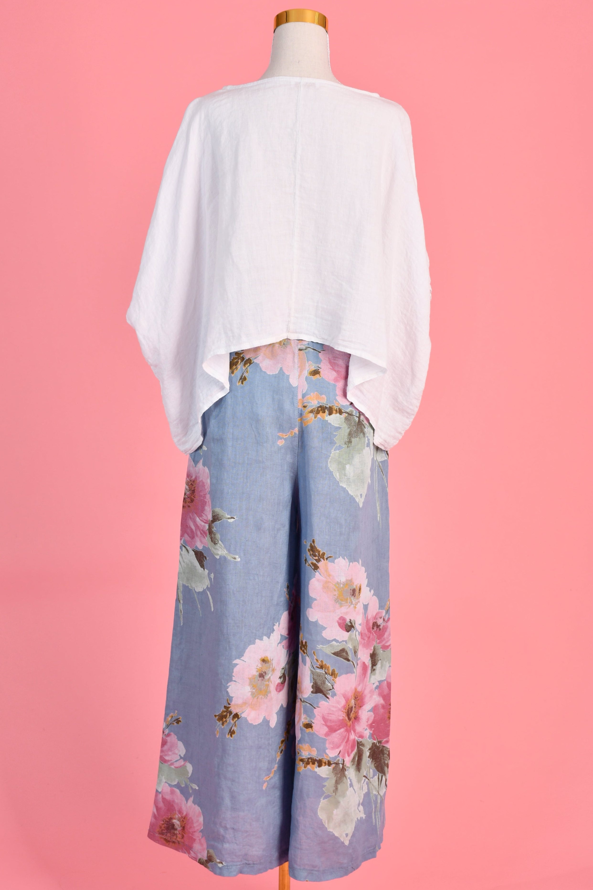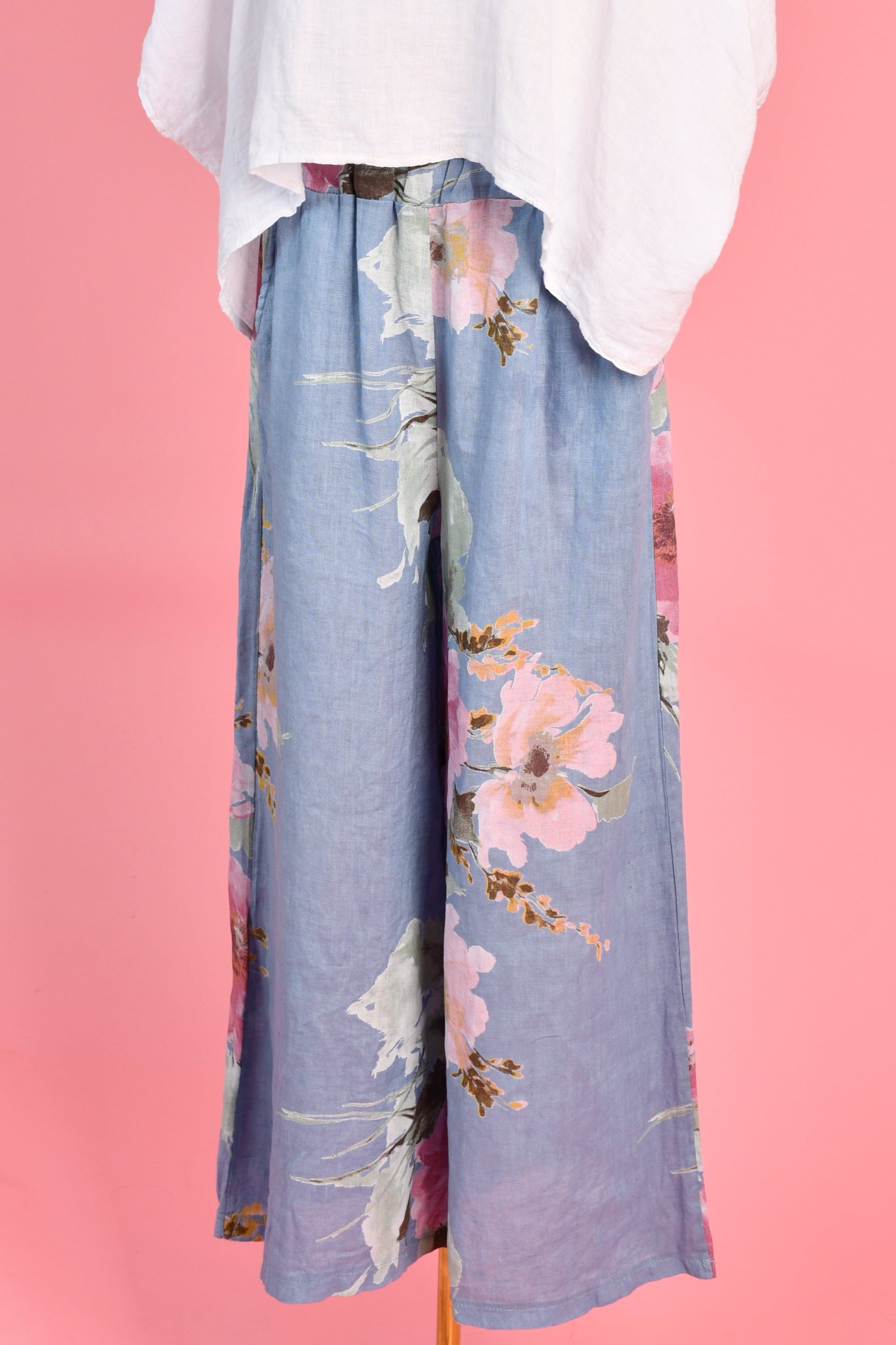 These flowy pants feature an elastic waistband, pockets and gorgeous floral detailing.      They are cool, comfy & so easy to wear. These pair back perfectly with our wide range of Italian linen tops