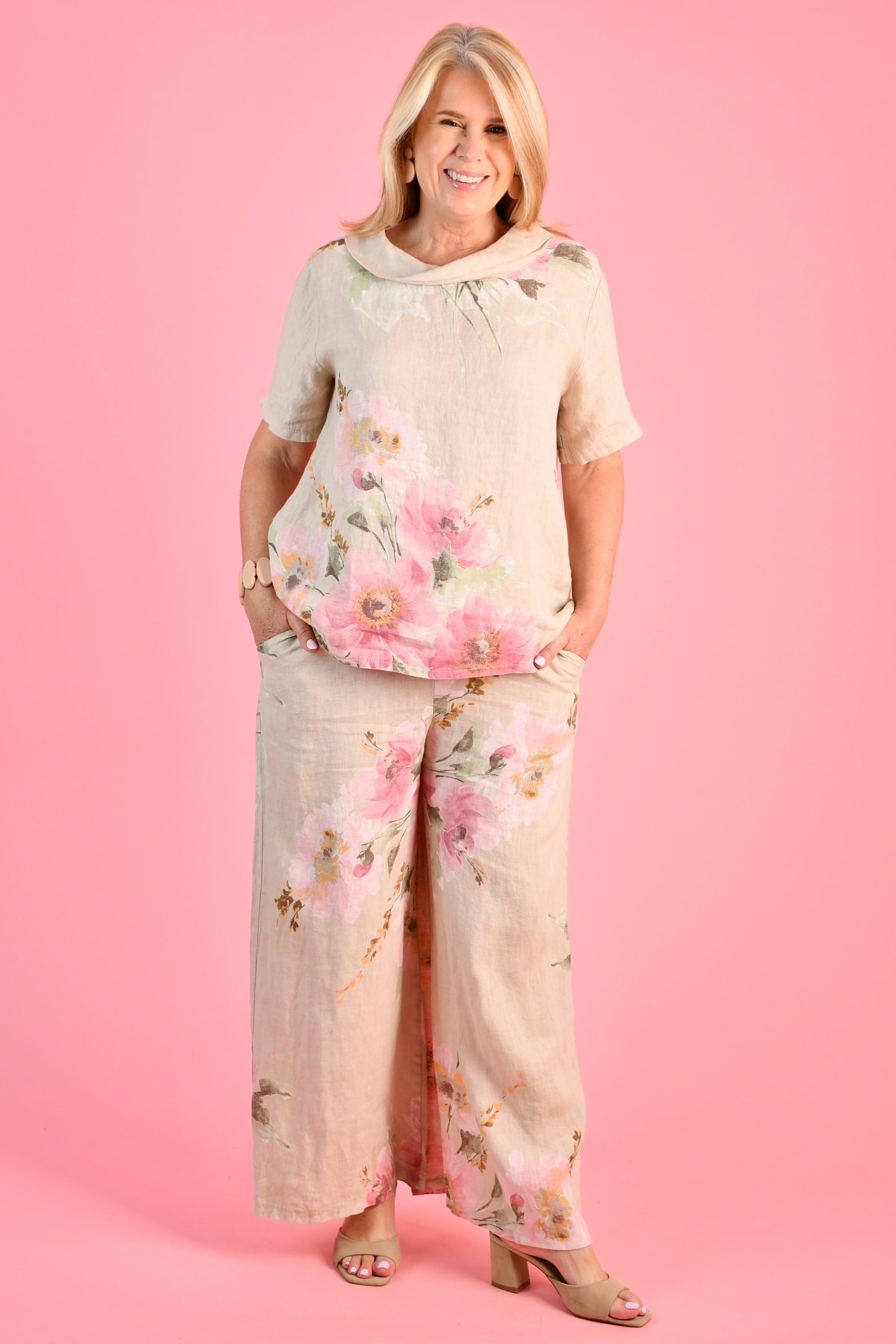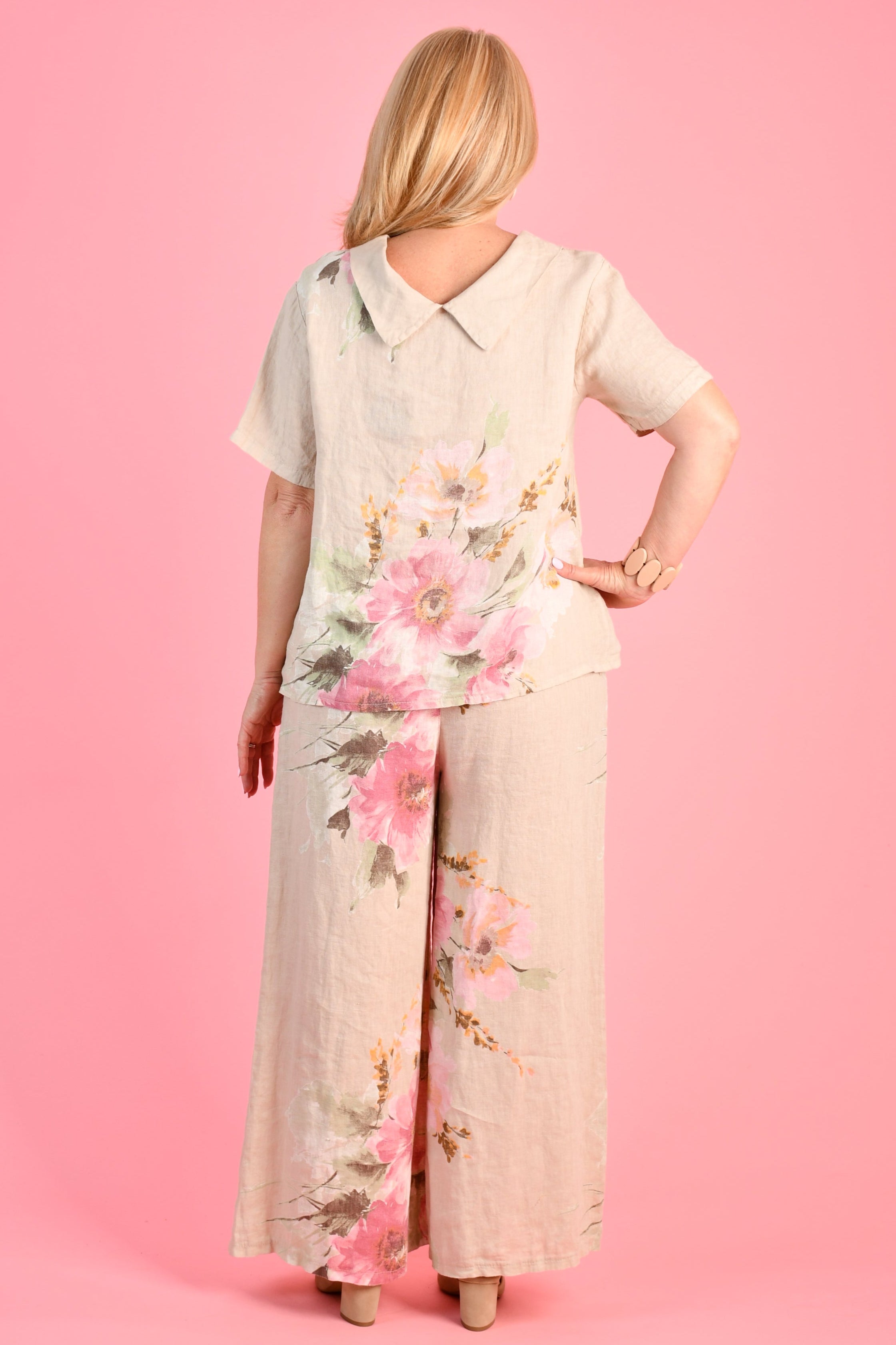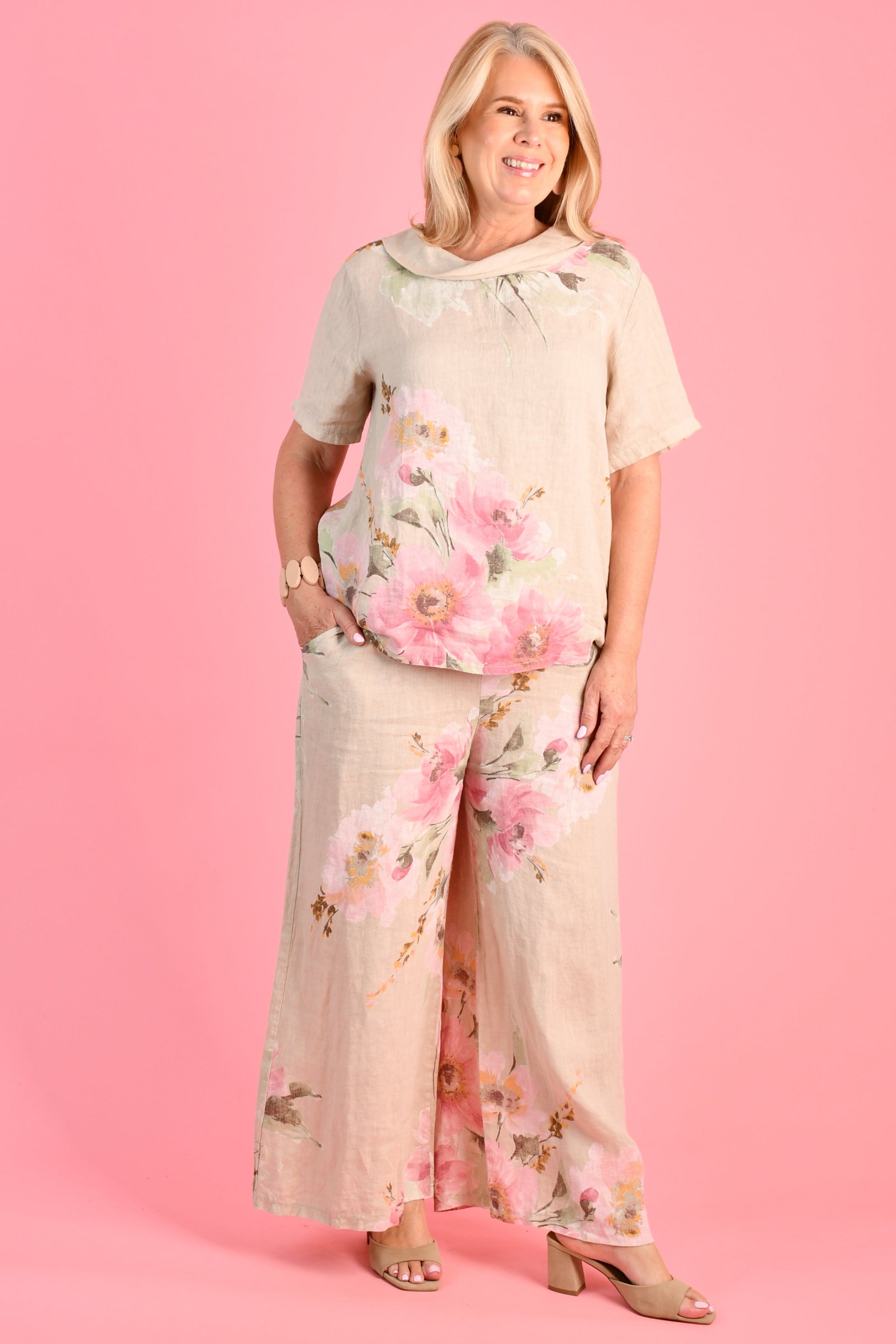These flowy pants feature an elastic waistband, pockets and gorgeous floral detailing. They are cool, comfy & so easy to wear. These pair back perfectly with our wide range of Italian linen tops